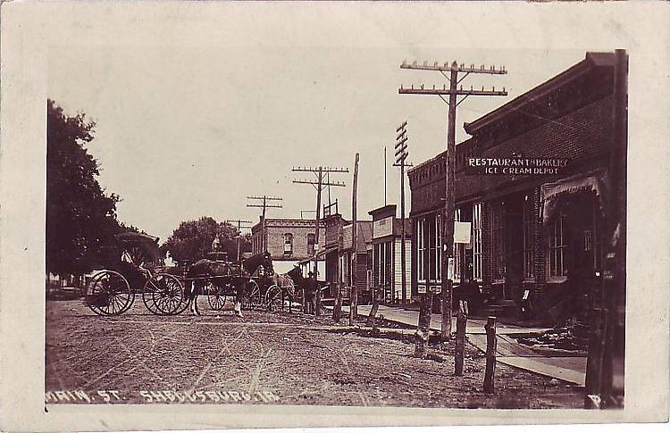 Real photo of the double-ten-pin crossarm lines that traversed thru this rural comminity around 1900. Hemingray and (H.G. Co.) insulators were commonplace in that day throughout the midwestern United States and goodness knows what fabulous colors adorned the street scenery/landscape through comminities like this back then! |