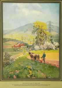 Image created c.1936 and gives us a glimse of what a typical steel-constructed power line looked like as it transversed through the countryside about 80 years ago. I'm sure scenes like this still exist along some backroads of rural America.