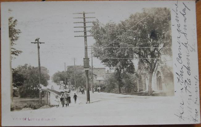 Soon to be the home of the very famous Lapp Insulator Company, this is what this little community's center looked like a bit more than a hundred years ago. The multi-crossarm pole connected telephone circuits inside a wooden terminal box (as seen on the pole). From there paired wires likely led to the village's central telephone office nearby. The shorter pole on the left appears to have carried electric lighting circuits. The two small objects on the crossarm either were enclosed fuse cutouts or lightning arresters. |