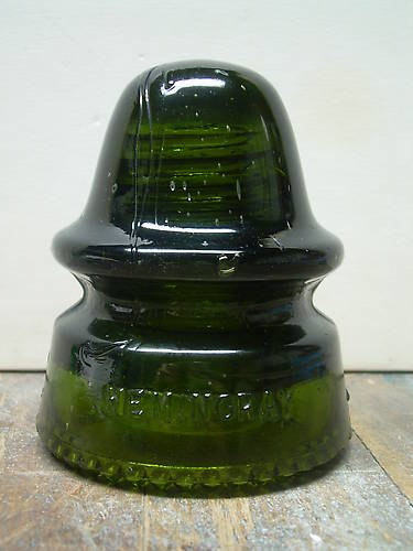 In response to Pat Scott's best wild find, I present the following dark olive green Hemingray No. 19 (picture is lighter than in person). I found this one back in 1998 only 3 months into the hobby. I new of a poleline in the process of being wrecked out so I walked the line for about a mile. This was the only one and it stood out like a sore thumb among all of the downed poles. Absolutely mint, I will never need an upgrade. |