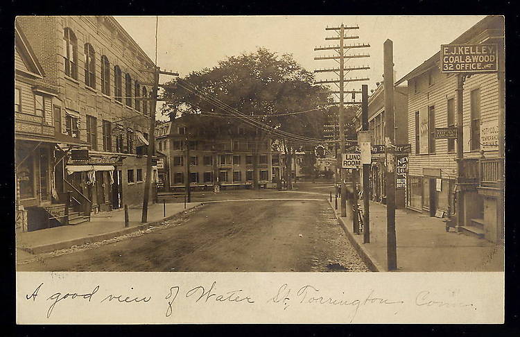 This image is among my finest and favorites depicting how glass insulators were used here in New England! Shown are electric distribution (on the shorter crossarms, especially to the left) with telephone circuits on the longer 10 and 12-pin arms. On the right atop the poles possibly are fire alarm telegraph circuits. Check out "View Original" on your browser for very best clarity. Most if not all of the insulators in this photo appear to have been made of glass. The Brookfield Glass Company in New York likely was the source of most along with others that once existed elsewhere in New England. Hemingray (H.G. Co.) insulators were rather uncommon in the New England states until the Brookfield plant closed around 1923. |