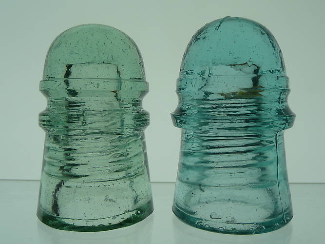 In the spirit of keeping the "Insulator of the Week " strong and informative, I am posting a pic of the two 105's in my collection. The first up is a light green smooth dome while the aqua is the lines over dome with six rows of dots! Enjoy. Still looking for any info or thoughts on the purpose of the lines over dome, smooth dome or the lines and dots over dome. |