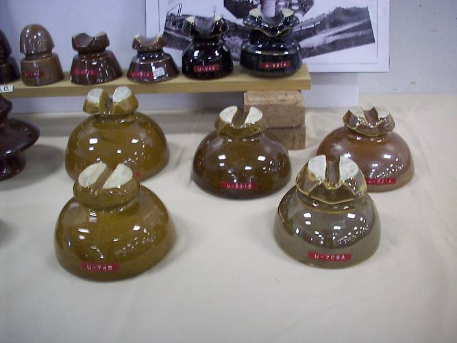 Part of Elton Gish's New Lexington display showing the speckled tan glaze of early NL units and the crude metallic glazes of others.