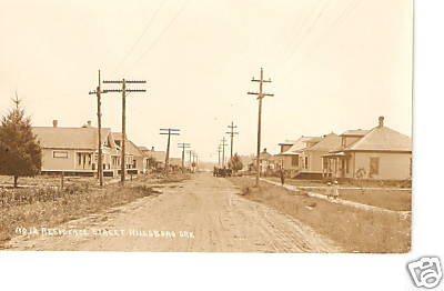 Photo 1910 or a bit later. I'm sure the electric three-phase circuits atop the poles on the right carried some very interesting insulators...either glass or porcelain. On the left are communications lines which most probably provided telephone service to residents in this locale (photographed on Residence Street in the above town). |
