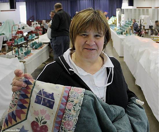 Marge Frank at the show early Sunday morning. Even though she has a blanket, I don't think she slept there. Russ and Marge had the "Not Real Insulators" display which won the award for Most Educational Display. I worked a trade with Russ. Some mini insulators for a Mid-Ohio mini commemorative. Nice People! |