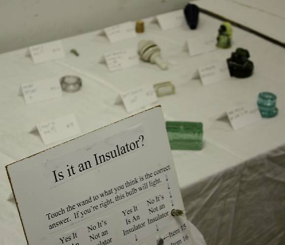 Is It An Insulator? Display. A hands on display allowing the viewer to check their answers via electrical contact. A light bulb would light indicating the answer. It was used so much the batteries were drained.