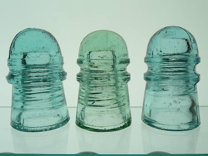 I find these little Am Insulator pieces fascinating. As far as I know this picture represents the three dome types known and the basic colors available. No info is available on why there is different dome embossings. It is now a known fact that CD 105s where manufactured at the Lyndeboro(LYNDEBOROUGH) Glass House in NH. If you have any ideas on the dome variants please drop me a line. Also note that all three have different wire ridge configurations. |