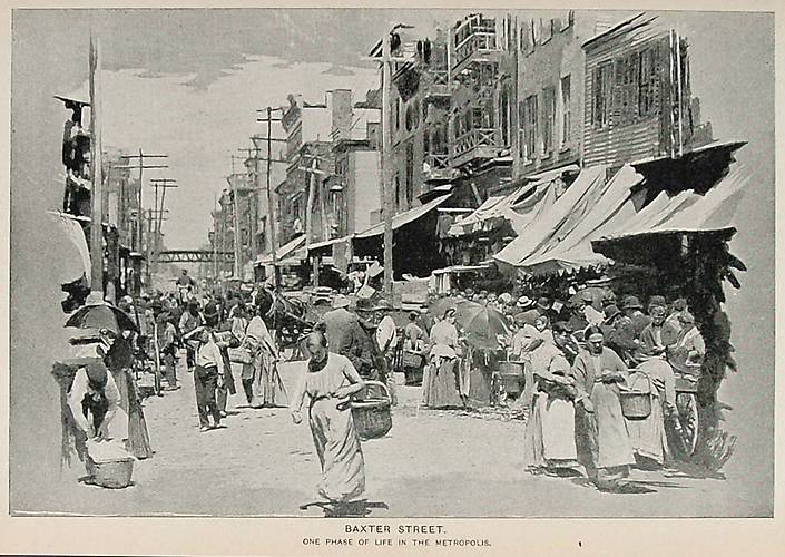 Image depicting everyday business life in the "Big Apple" along Baxter Street in 1893. Note the variety of pole lines that pararelled the roadway. In my opinion these were for electric distribution, telephone and telegraph circuits serving each side of this busy neighborhood! |
