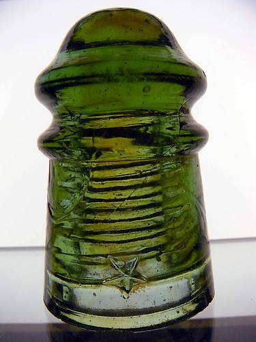 Here is a really nice green with ambering that is pretty strong...see photo. Ping on the dome, 2 base chips, one is very very small, wire rim chip (upper rim), some nice surface texture from cooling marks. $20.00 plus shipping.