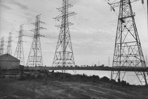 These mighty, fine looking towers stood at a river crossing at an unknown location in the eastern United States. Apparently these lines connected to electrical generation sources nearby.