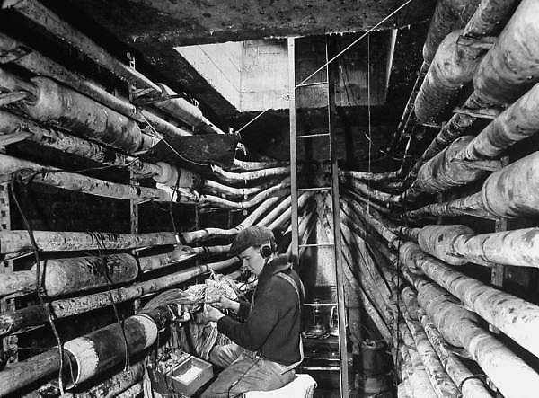 Surrounded by many lead-covered and large telephone cables, this gent is seen comfortably working at his mastered trade beneath a New York City sidewalk some 70 years ago!