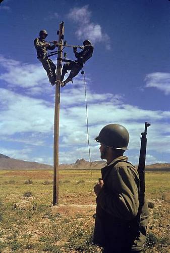 Photo illustrates American forces on duty stringing open wire telephone line using what appears to be insulators of non-US origin.