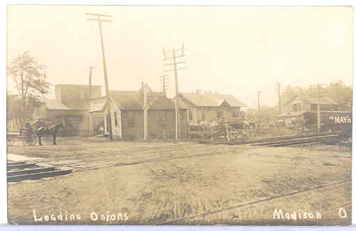 A telegraph pole pararelling the railway in the foreground with two wooden boxes on the two upper crossarms provided "dry spot" connections between the open wire and rubber-insulated twisted pair cables which led to a telegrapher's office in one of the adjacent buildings. |