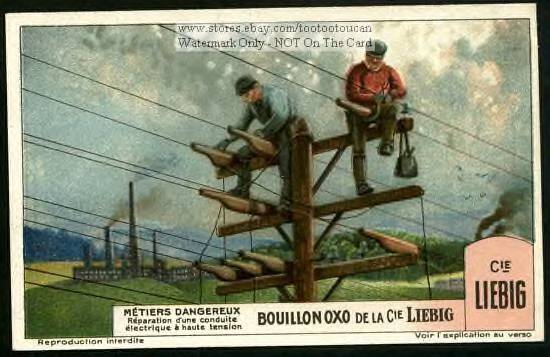 Illustration depicting lineworkers on an electric distribution pole in France around 1920. I have no idea what the insulators might have been.