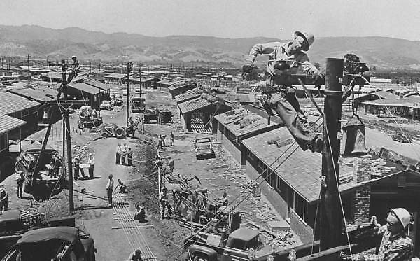 Photo taken in California within Pacific Gas & Electric territory as a vastly large and new housing development was under construction (location not known). Check out the glass insulators on the lower crossarm in the foreground waiting for new wires to be attached to them! |