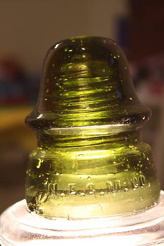 Here is a CD 162 I got the weekend before the New England ice storm this year. Saturday morning driving my wife(Kim) to school, three local lineman were taking two pin cross arms down, Kim told me they will not be there when you get back, so turn around an ask them. So i did, very glad i did. so here it is underlit to see color.used a craftsman haliogen light with a fish bowl on the light. to keep the heat away from the insulator. |