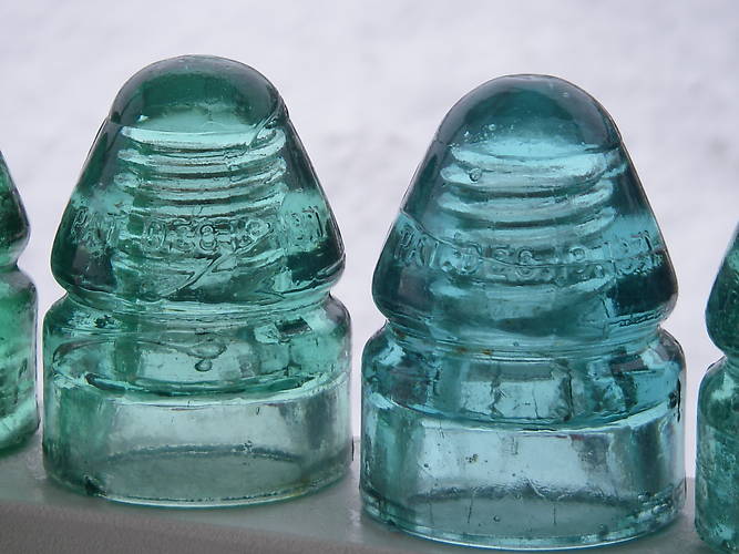 CD 132 'one liner's' that happened to be under my tree on Christmas morning. Even without the snow filled background, these are really, really cool insulators! VVNM with only a tiny chip on one base edge. Pretty uncommon for bullets, especially of the single line variety. |