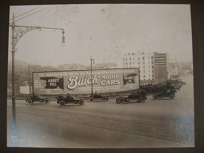 *Very impressive* and unmistakeably grandeur Buick Motor Car advertising sign in the background with a grouping of Buick automobiles tooling around in the foreground. In addition there is a neat ornate street light pole with fixture on the left. Exact location unknown. |