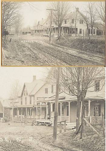 In the top photo you will note a six-pin open wire line which served residents of this community. In the lower picture is a close up of a shorter pole (far left). It is probable the latter was for public telephone connections to a general store or rooming house as seen in front of it. |