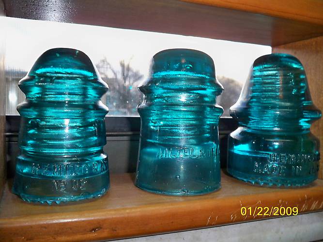 Three nice hemingray blue insulators the CD 113 i found on a drop line off the side of an abandoned house. sweet!!