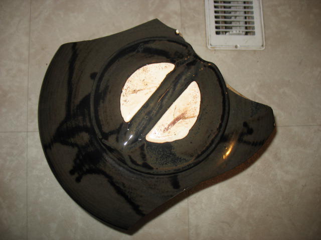 Here is the top view. It wouldn't be so bad if whomever broke this didn't throw away the pieces. Even the top glaze had character.