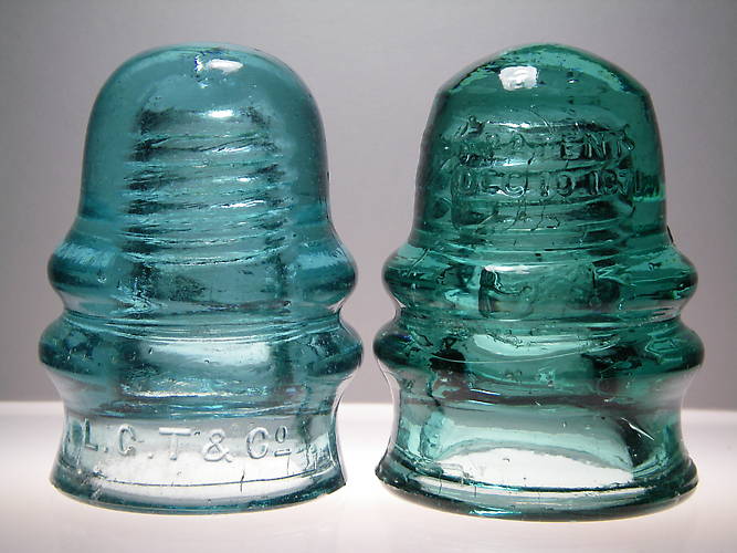 On the left is an L.G.T.Co. in a brite sky blue and on the right is a Patent / Dec. 19.1871 in a darker aqua. In comparing the two side by side, note the perfectly rounded dome and narrower base on the L.G.T.Co. Both are almost identical height with similar wire groove features. Both are in VVNM condition. I have been wanting to do this comparison for a long time. Many Thanks to Rick Jones who agreed to part with the L.G.T.Co. and make this possible! |