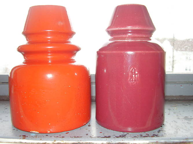 Here is the neatest pair of porcelain insulators I have. The Red piece on the left is very vibrantly glazed and the piece on the right is so dark it almost looks like a purple glaze!