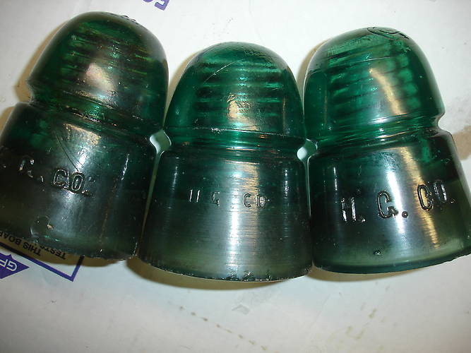 Three different sizes of H.G.Co. Embossings on the CD 145 B-hive Insulator. The smaller embossing has no "H" on the dome unless it got filled in with glass. It looks like an blot-out on the top of the dome. The smaller of the three embossed CD 145's in the middle is very seldom seen at least around my area. Thanks and enjoy the pictures. |