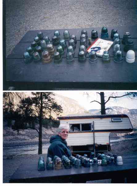 Over the Easter weekend, Bev and I went collecting in the Spences Bridge area. We had a super trip, managing to find some nice glass, Bev spotted 4 herds of Rocky Mountain Sheep, totaling 56 animals. The RCMP officer drove right on by, even though I was at the top of a pole, not 30 feet from the road, and we were nice and cozy in the camper at night. BTW.. We're still using lots of paper plates until I find someone who doesn't mind doing dishes!!! |