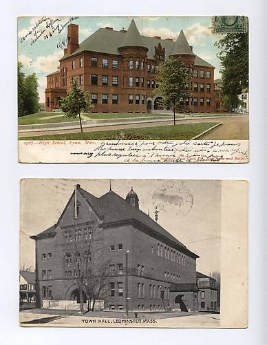 The top picture is a high school in Lynn, Ma postal dated April 17, 1907 [no name given] and the bottom picture is the town hall in Leominster Ma. with a postal date of Feburary 25, 1909 A single pole and wire is seen in this photo. Possibly a Lefferts Hook ??? |