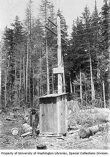 Powerline pole with a posted warning sign for vandalism, Washington 1901 Maintenance shed or outhouse? I wonder what the warning sign says, probably something like "don't shoot at the insulators" and "high voltage". Can anyone tell me what insulators are on these poles? |