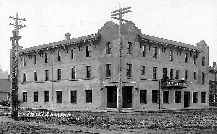 Picture of an old hotel, Shelton WA 1913. Note the transformer on the small scaffolding on the left.