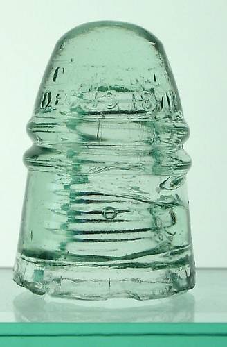 A color close to clear with a hint of green, this example shows the large embossing style inherited from the retooled 124.1 moulds. A large open bubble protrudes from the pinhole to the right. This is a not-so-unusual trait for these early 1871 Patents. |