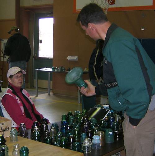 Here is Bonnie Trueblood again with Nathan Lamkey picking up a Chambers. Nathan puts on a great insulator show each year, I missed his last show and probably some great insulator deals as a result. I have seen very rare and unusual insulators offered at his show in the past. |