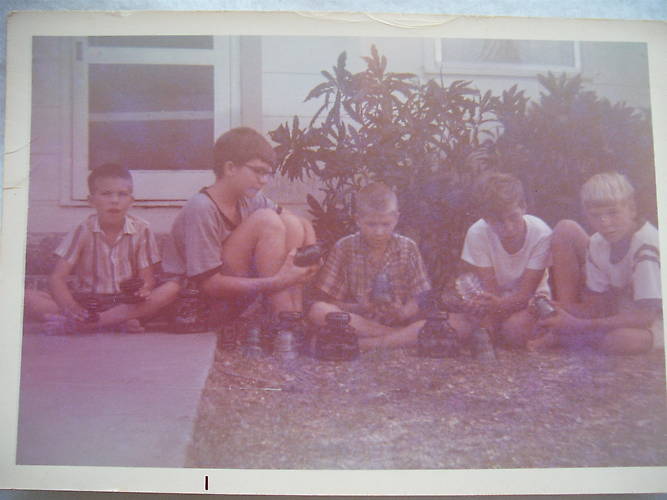 Here is an early photo of the insulator collecting Colburn brothers circa 1971. Left to right: Jim, Jerry, Alan, neighbor kid, and Paul. Note the wonderful 'el-cheapo' type insulators that we had found or purchased in the Lake Worth, FL area. I am holding two standard porcelain 3 " rack spools. Real valuable even now! We picked up any and all glass and porcelain insulators that we encountered back then. Enjoy! |