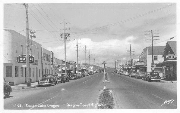 The same location as the previous photo a few years earlier, US 101 looking north through Oceanlake (now Lincoln City, OR.). Note that the Tri-County Tel. Co. had one more cross arm of open wire in service along with the US Coast Gaurd defense line. (top cross arm). Across the street The Mountain States Power Co. poles are in view but look what's missing. The new street lights! I see only one old style light on the corner to the left and it may be an old radial wave type. |