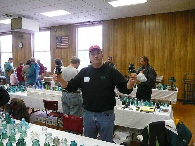 This is a pic of Corky Miller of South Amsterdam N.Y. Corky explained to me one of the dangers of constantly handling glass insulators is severe mutations. Corky shows us the effects of his actions. His thumbs have actually mutated to CD 152 Olive Green Brookfield Hoopskirts. Please note, this is a severe case. My apologies for the graphic nature of this picture! |