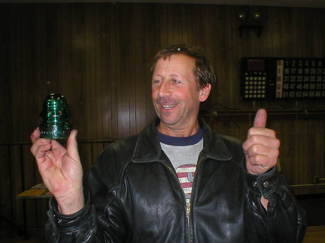 Jim is ALL smiles as he carefully holds a show-n-tell dark teal Pettingell Andrews insulator. Jim is from Brockton, MA and is a specialist in these as well as related CD 134 Pennycuick variations.