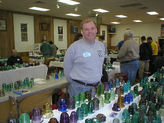 Here is the gentleman who made this very memorable event possible....Yankee Pole Cat Insulator Club (YPCIC) President.... John Rajpolt! The YPCIC annual show and sale was held at the American Legion Hall, 566 Enfield Street, Enfield, CT on Sunday March 29. It became a reality as a result of John's devotion, organization and hard work during previous months. Set-up began around 6:30 AM and the doors opened to the public at 8AM. Approximately 30 sales tables and two insulator displays adorned the hall until everything began to close shortly after 2PM. Insulator collectors from as far away as Canada and Great Britain attended as well as others from Texas, North Carolina and Maryland. Insulator enthusiasts representing most of the Northeastern United States filled out the remaining attendance which was described by many dealers as "excellent". The show was well publicized and brought in a steady walk-in crowd throughout the day despite the rainy weather. Free exposure to the general public via Craigslist listings within 200 miles of the show site very probably brought in a number of people who hadn't known that insulator collecting was an organized and established hobby. Among the nicer pieces from NM to mint condition which exchanged hands were: a CD 740 Fosters blackglass threadless; a cobalt blue Hemingray -19; a CD 263 Columbia; a CD 164.4 Fry in blackglass; a CD 126 Brookfield (crown embossed) in bright yellow-green; a CD 122 Mclaughlin-16 in citrine; and a CD 134 T-H.E. Co. in a nice yellow-green. Sales of less-expensive insulators (under $50 each) were reported by the sellers as most predominant. Many rare and seldom seen insulators were on display and for sale. See the following photos for details. The YPCIC holds their annual show and sale in the north-central CT vicinity each spring. This year's show site has remained the same for many years since it is convenient to I-91 and at a central location among the attendees. In addition, each year the Pole Cats host an informal meet and barbeque in July (in Milford, MA) and during early Fall at the home of Larry Emmons in East Hampton, CT. Be sure to attend! Watch for details about upcoming YPCIC events! |