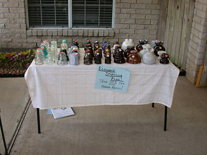 A sign of these troubled ecomomic times seen at the Lone Star Insulator Club's swap meet and pot luck recently in Pearland, Texas.