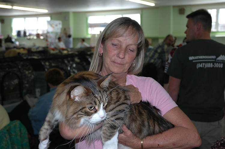 The two quonset huts next door to this year's show, which were home to the Wheaton show for many years, had a cat show going on this year. I'd like to borrow this big boy (a Maine Coon cat) for a few days - maybe he'd teach our cats some manners!
