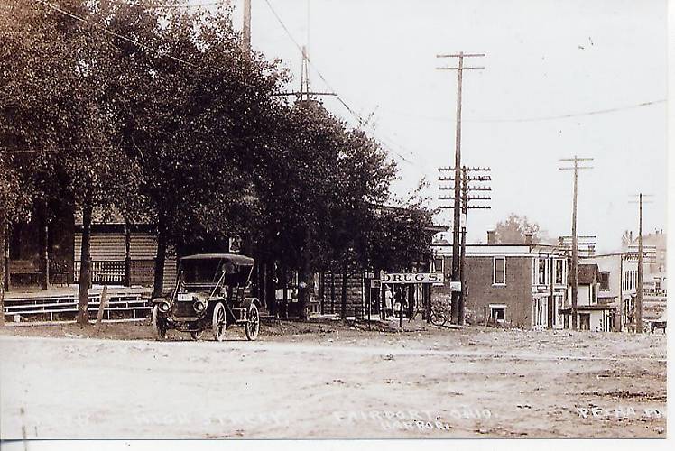 Note the vintage automobile parked on the left. The open-wire lines seen likely were subscriber and long distance circuits leading into this Ohio community. Some sort of upgrading was in progress when this photograph was taken on account of the taller poles standing along side the shorter ones. |