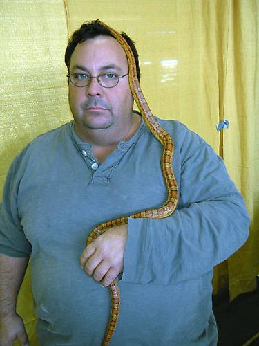 Eric Johnson lets the snake gather some warmth from his head. I 'd prefer to use a lamp Eric. Too close for me.