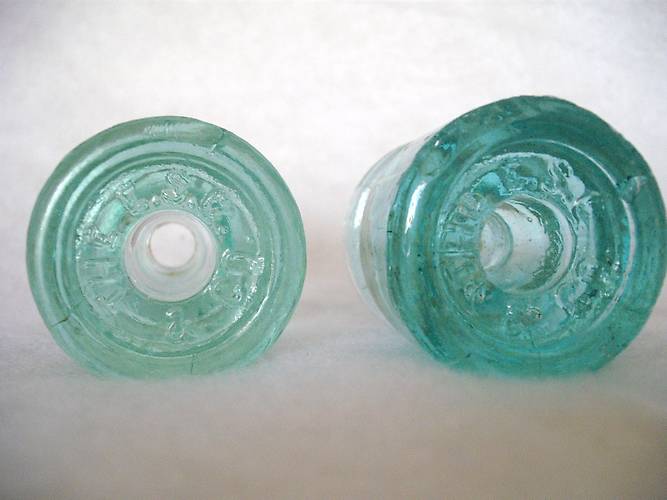 The embossings should be clear enough here to read: THE E.S.G. // & CO. These were made for the E. S. Greeley & Co of New York. Link to the side view of these same two insulators; [id=244213482] These have a slight variation in height, but are close to the book size of 1 7/8" tall, bases are 1 1/2" across. |