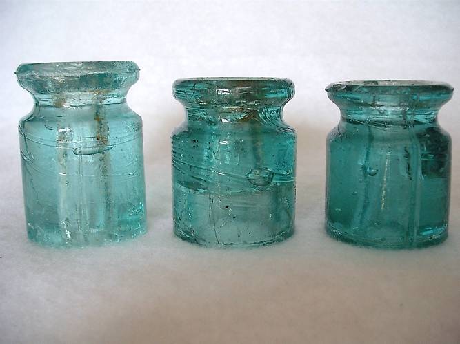 This group fits in the CD 1080 range. The tall one on the left is 2 1/8" tall! The left and right examples have a nail hole that is one continuous taper from top to bottom, unlike the drawing in the Price Guide. There is a lot of variation to the knobs in the PG! |