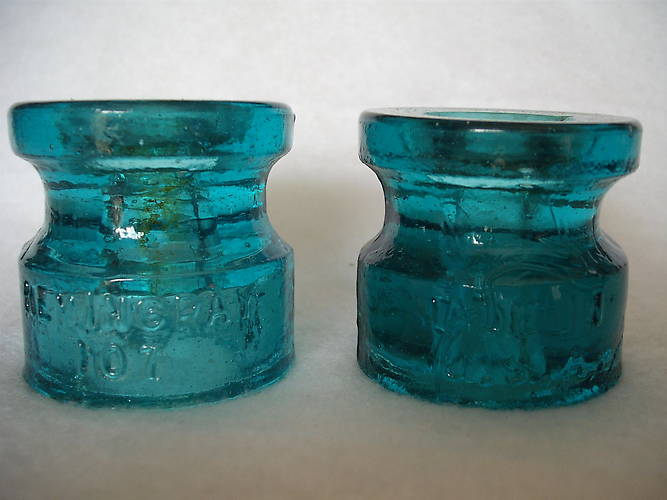 Forgot to post this one right after this previous photo: [id=244299993] This one shows two Hemi blue CD 1087 knobs marked: HEMINGRAY/107 // MADE IN U.S.A. Both of these insulators are Hemi blue, the one on the right has some surface haze which has made it appear much too dark in color. The one on the right is turned backward to show the reverse embossing. |
