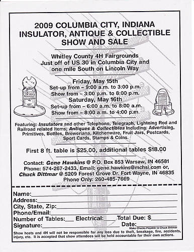 Here is the contract flyer with all the information on the Columbia City, IN Collectables show. You can email me if you have questions, or send $ and signed contract to Chuck.