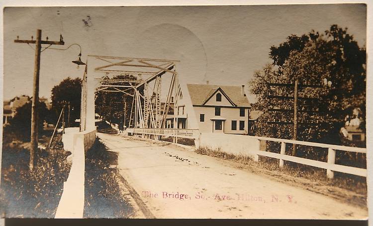 Classic "inverted cone" reflector-style street light on the left. If you look closely you will see a break-arm bracket on the crossarm above which terminated the wires in each direction. From each deadended connection a pair of wires extended down to the street light for its series operation. Also note the short telephone open wire pole with four 10-pin crossarms on the right. |