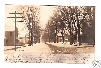 Nice snowy view of a New York state neighborhood depicting the good ole days with an open-wire telephone line extending along the left....