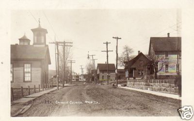 With an electric arc light illuminating this town's centre, a telephone open wire line follows the left hand side of this roadway complemented by an electric lighting circuit along the right hand side of this very unpaved roadway!
